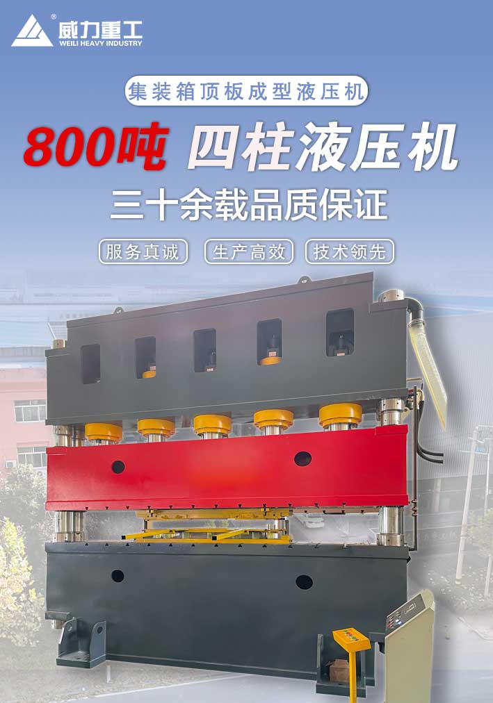 800吨四柱液压机是液压机厂家为海运集装箱顶板制造厂家设计的专用液压机,根据集装箱顶板规格以及压型工艺不同,液压机吨位有差别,本机以及多能,仅需更换模具即可。